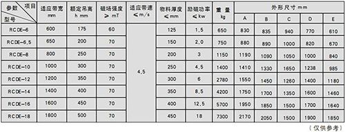 RCDE系列油冷式電磁除鐵器,內部采用變壓器先進技術,變對器油循環涼卻,全密封結構,具有磁力大、防塵、防雨、耐腐蝕、連續工作使用壽命長等特點,對輥壓機、破碎機等機械設備起著可靠的保護作用。其主要性能指標均過到或高于JB/T7689-95標準要求,該主品可除去混雜在非磁性物料中0.1~25公斤的鐵磁性物質。